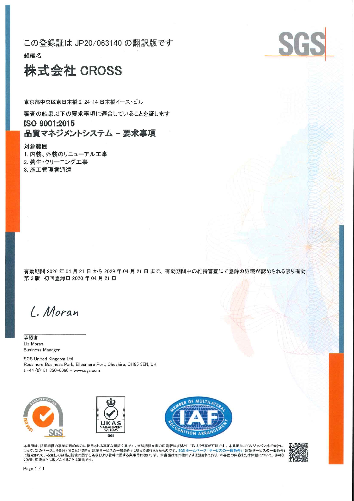 株式会社CROSSは、2020年度に国際規格である品質マネジメントシステムISO9001:2015の認証を取得しました。品質方針の元、常に安定した品質で、お客様の期待とニーズに応えるサービスを提供できるよう、品質管理と顧客満足度の向上を主眼においた活動に取り組んでいます。